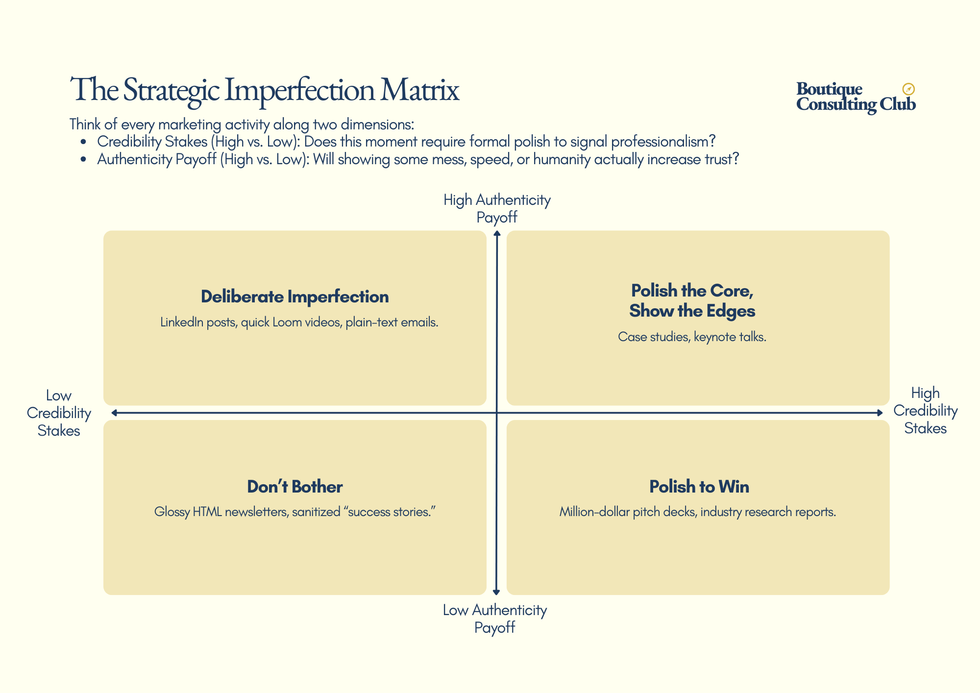 - Low Credibility / High Authenticity → Deliberate Imperfection