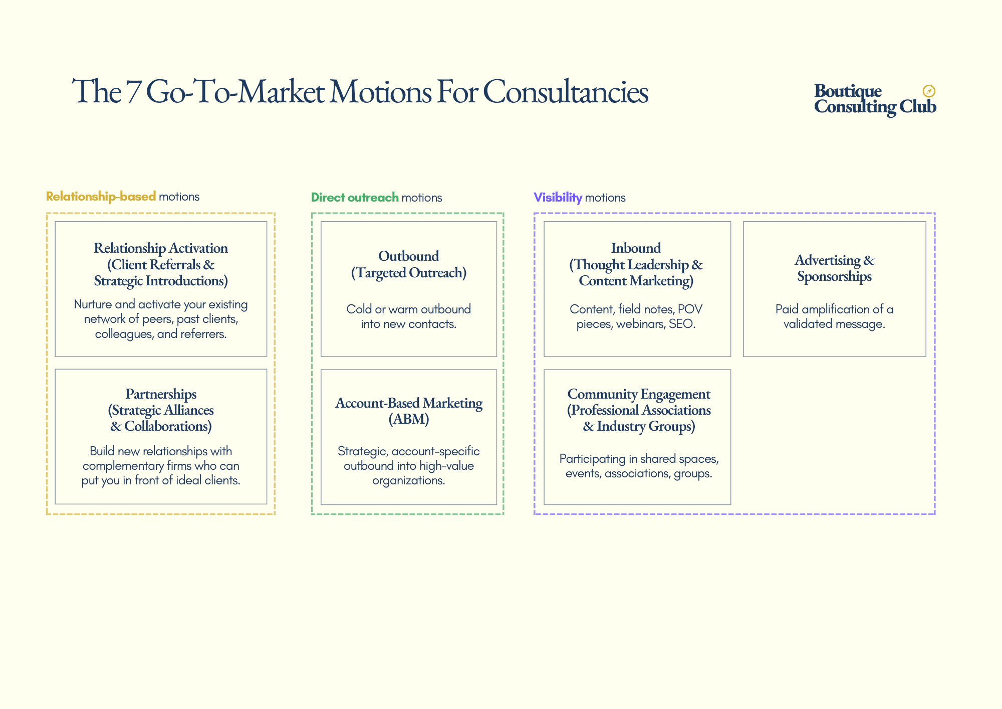 A quick clarification before we wrap up. This entire piece has focused on go-to-market motions - meaning the avenues, capabilities, and specific activities that help you acquire new clients. That’s why we haven’t talked about retention, expansion, or recurring revenue design, even though those are far more important for the long-term health of a boutique.