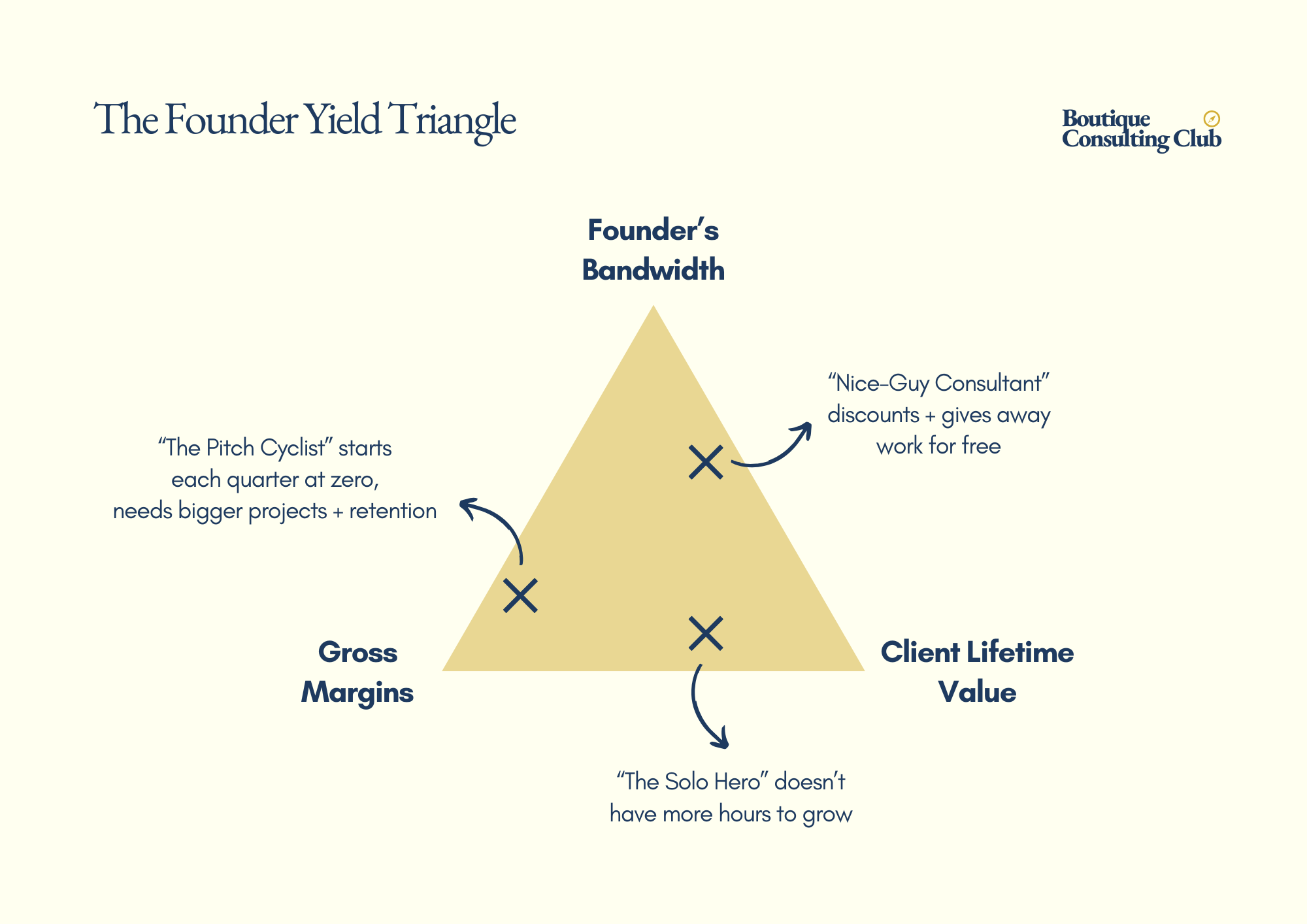Every founder-led boutique lives inside a triangle of three constraints: Margins, client lifetime value, and bandwidth. Together they decide the only number that truly matters - contribution per founder hour.