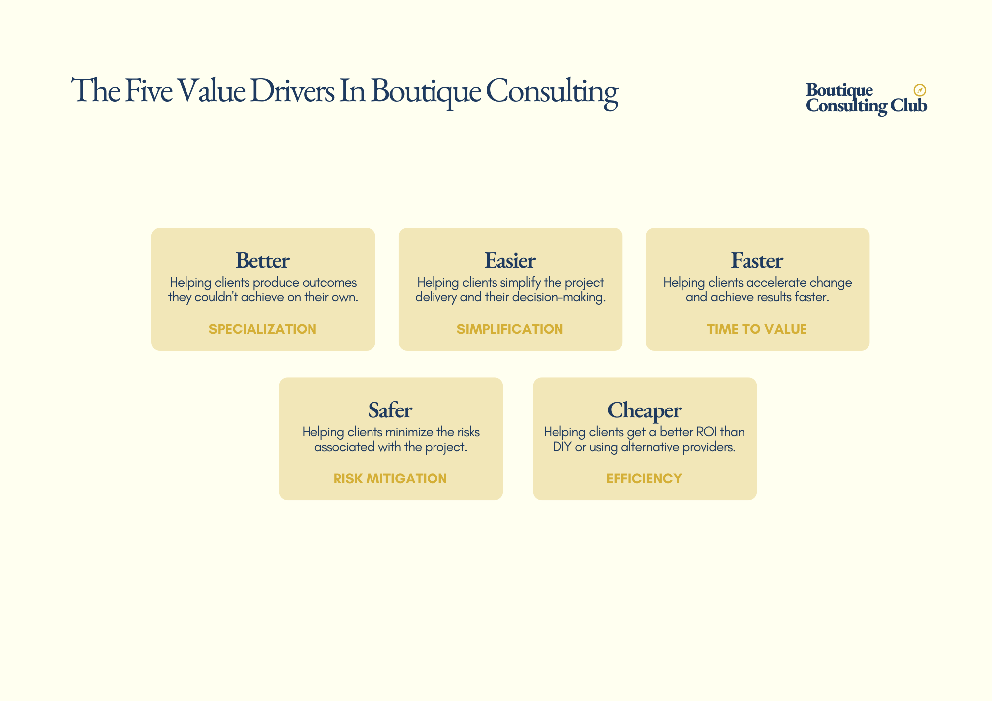 - Safer means you help clients minimize the risks associated with the project (regulatory, reputational, organizational). In an environment where a failed initiative can end careers and derail companies, this dimension has become more powerful than most consultants realize. Buyers are often more motivated by avoiding a bad outcome than achieving a great one. The consulting purchase is frequently a risk management decision dressed up as a growth initiative.