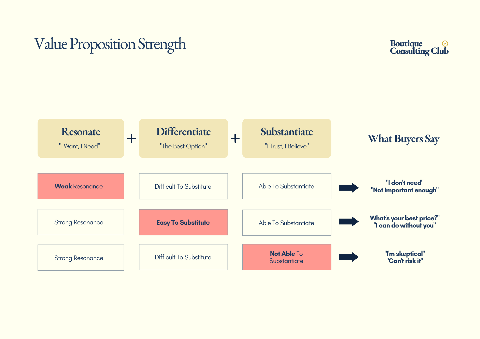 The three failures are predictable: a value proposition that doesn't resonate gets ignored entirely. One that doesn't differentiate gets treated as a commodity, and you end up defending your fees against alternatives that are technically worse but cheaper. One that can't be substantiated generates skepticism. Prospects who say "interesting, but not the right timing" when what they mean is "I don't quite believe you yet."