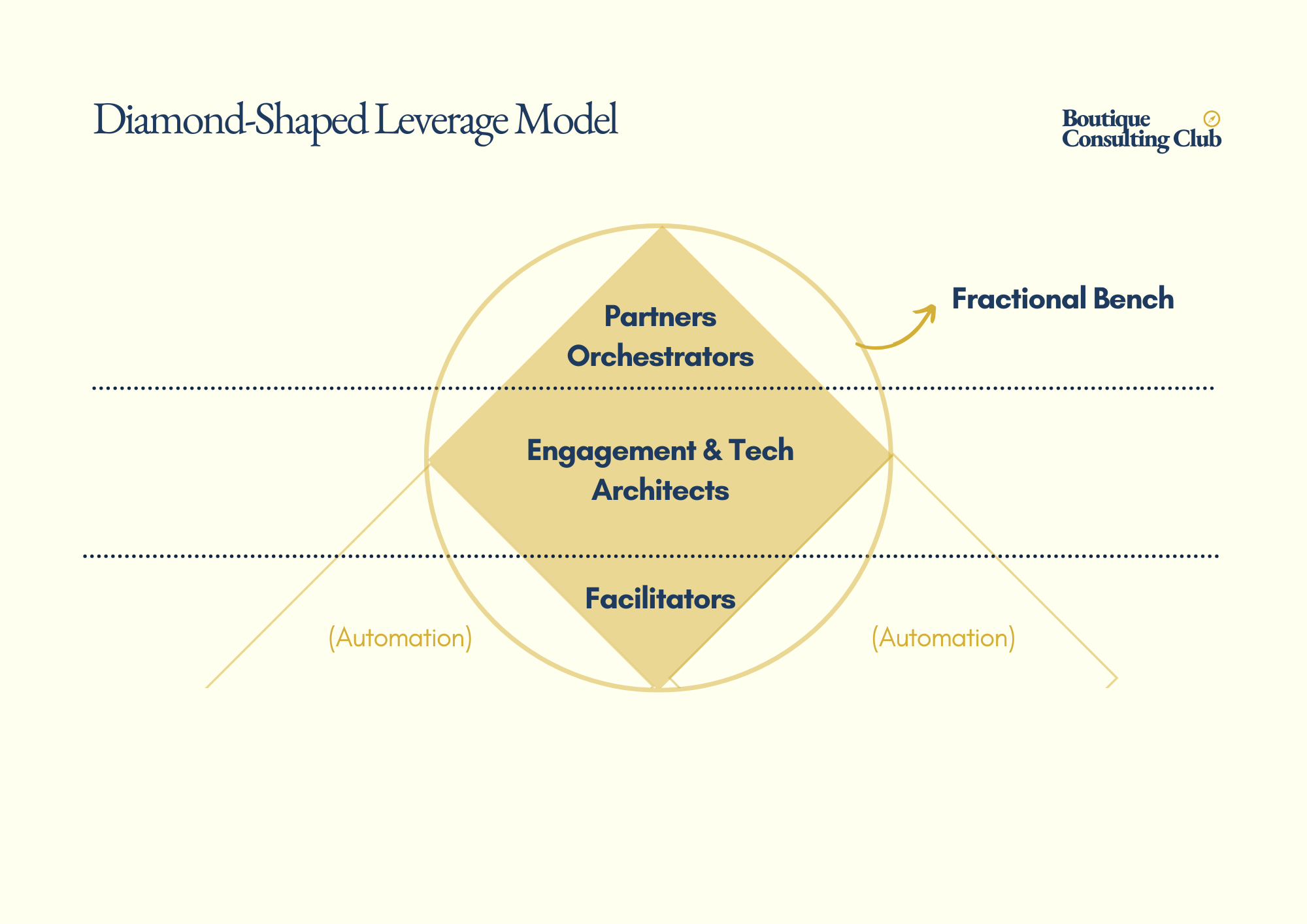 The shape that replaces the pyramid, in the boutique context, looks more like a diamond. The base is thin (and AI-augmented, or fractional). The middle is strong - experienced "architects" who can translate strategy into delivery, run workstreams, and maintain quality without the founder hovering. The top is small: a partner or two who orchestrates relationships, frames problems, and owns outcomes.