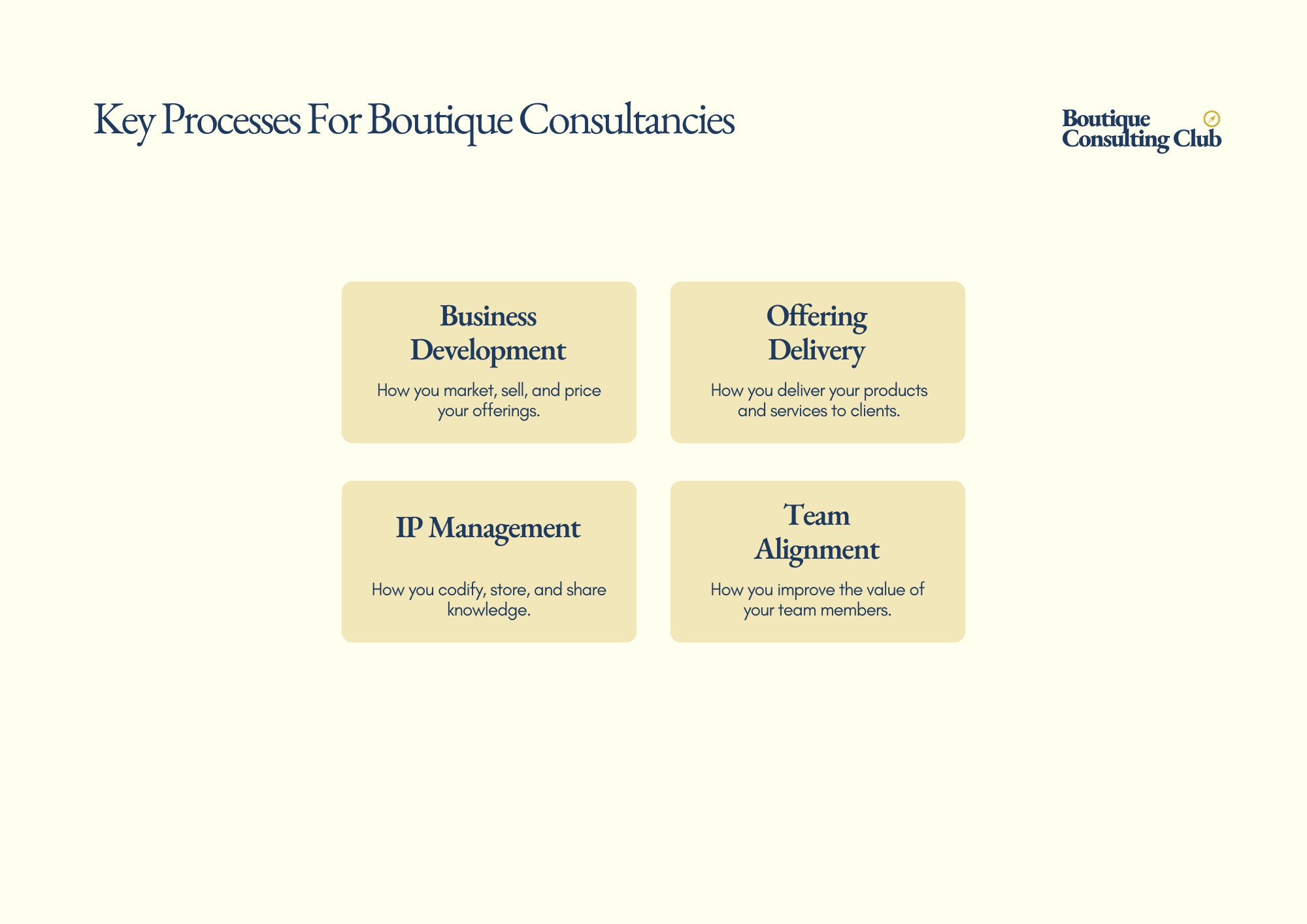 - IP Management: Is anyone responsible for keeping your methods current? When did you last review or update your core delivery assets?